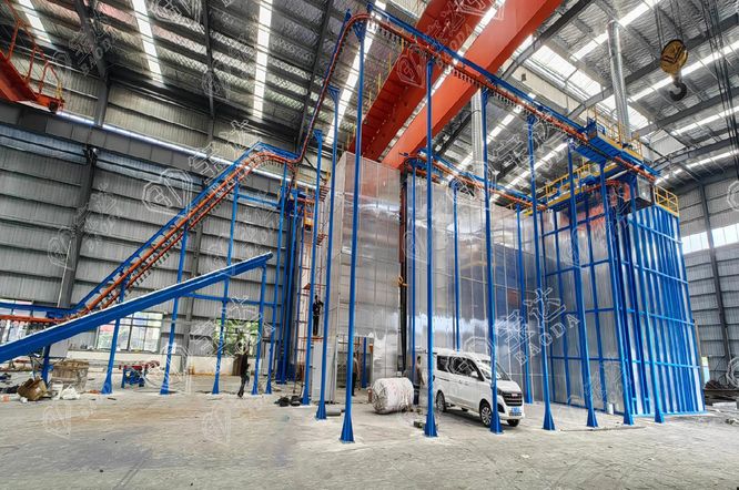 1. 悬挂输送系统采用3驱动同步,十字轨链;旋转挂具-完成单粉房两面喷涂。